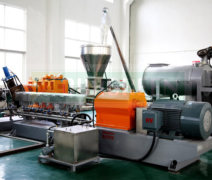 特有的雙螺桿設計使得原料可以充分混合,有效確保了終產品的結構和密度,根據物料在螺桿中的溫度、壓力、黏度等的變化特征,可將螺桿分為加料段、壓縮段、均化段和混合段。雙螺桿擠出機特有的結構,將原料充分混合,螺桿轉速高,物料停留時間短。